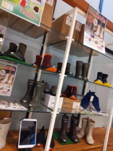 そして、レジ前には靴が大量に陳列されています。10月中旬のAコープのイベントで人気があったガーデニング用の長靴など期間限定で販売しています。