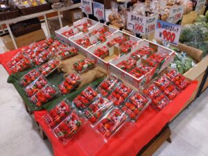 農産物も長崎県産が揃っています。イチゴは「恋みのり」「ゆめのか」がよりどりパックで900円!スナップエンドウ、ブロッコリーなど販売しています。
